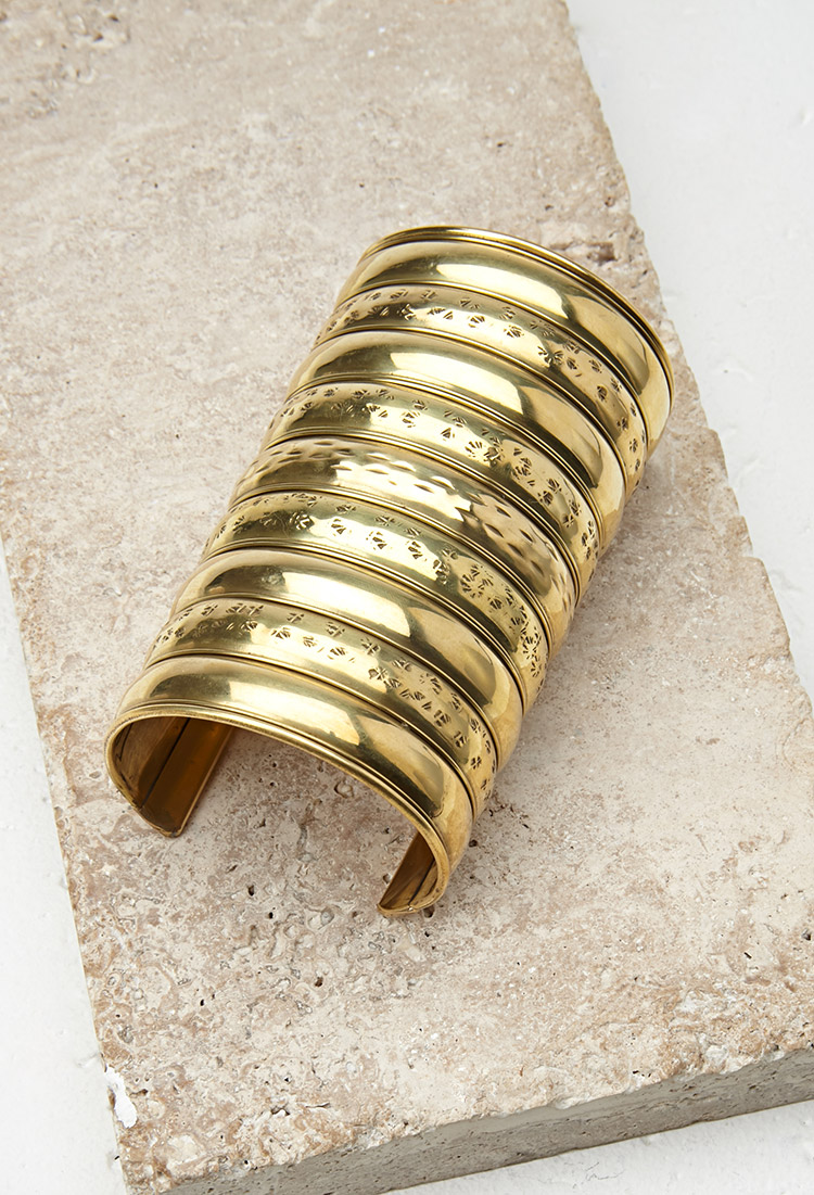 Her gold arm cuff, is very like this Forever 21 Etched Arm Cuff $10.90