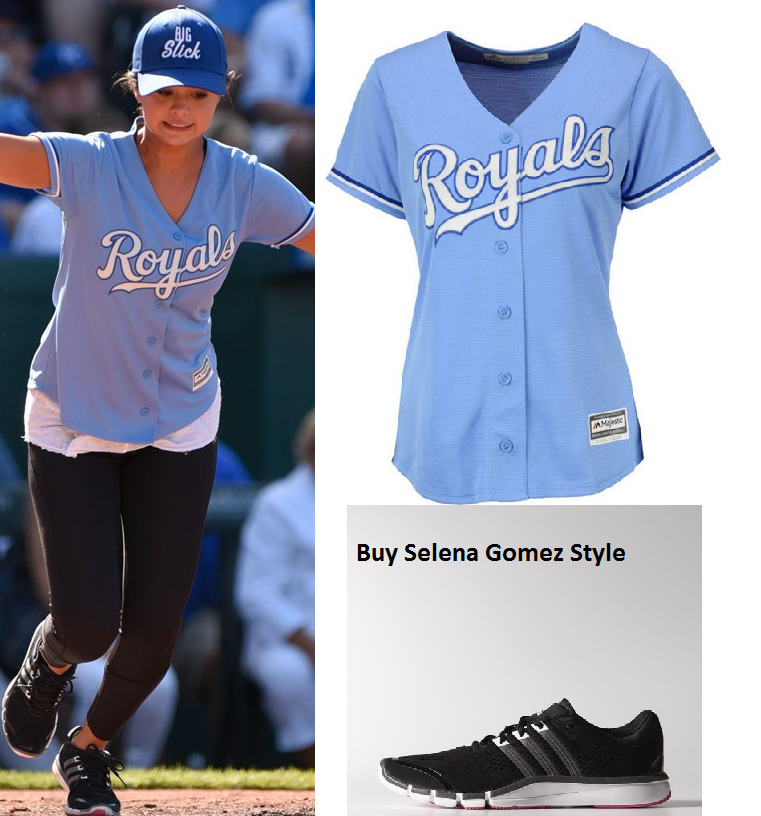Selena is wearing a Majestic Women’s Kansas City Royals Cool Base Jersey $70.