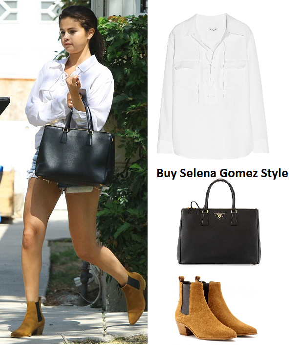 Selena’s white shirt is an Equipment ‘Knox’ Linen Lace-up Shirt $208 now sold out.