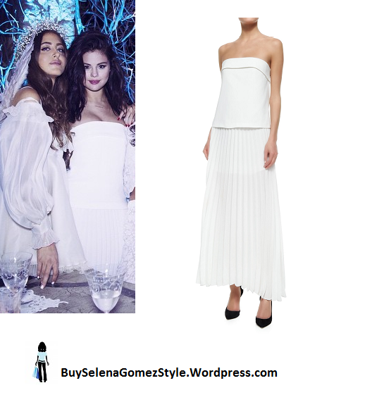 Selena was wearing a white strapless dress with pleated skirt, and I’m thinking it is this A.L.C Brock Strapless Pleated Maxi Dress $625.