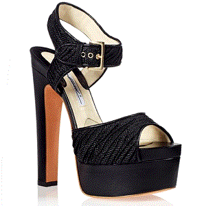 Selena’s shoes are double-platform black satin Brian Attwood ‘Karin’ sandals, now sold out.