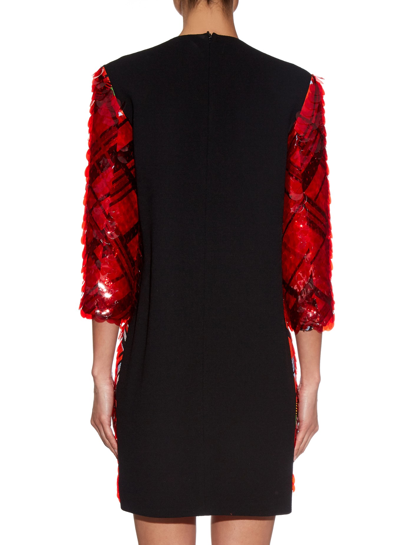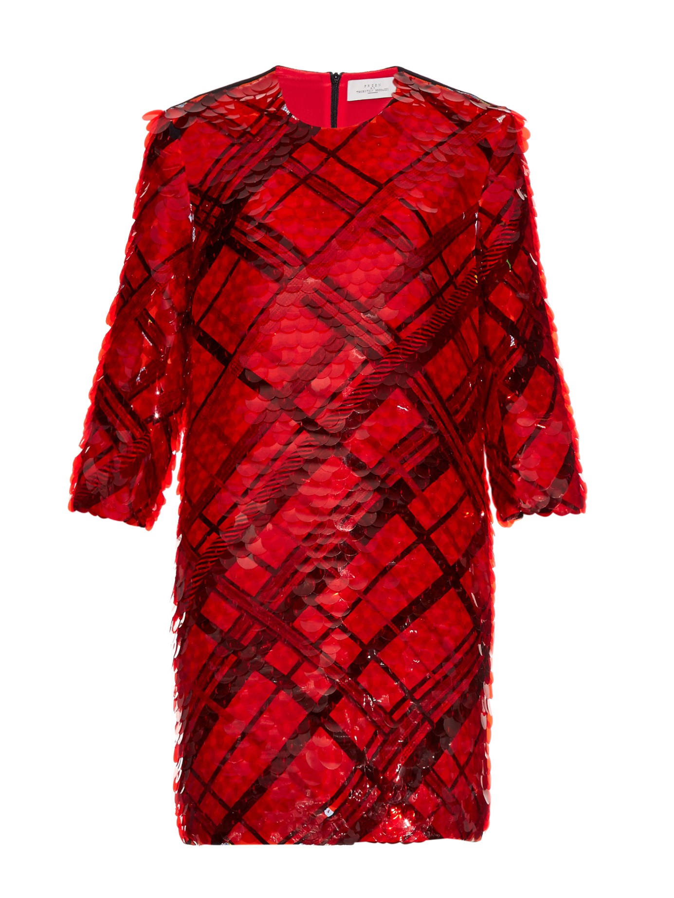 Selena is wearing a Preen by Thornton Bregazzi Arcade sequin-embellished mini dress $1,915. This dramatic check-print mini dress combines a red-sequin front and a black wool-crepe back panel.