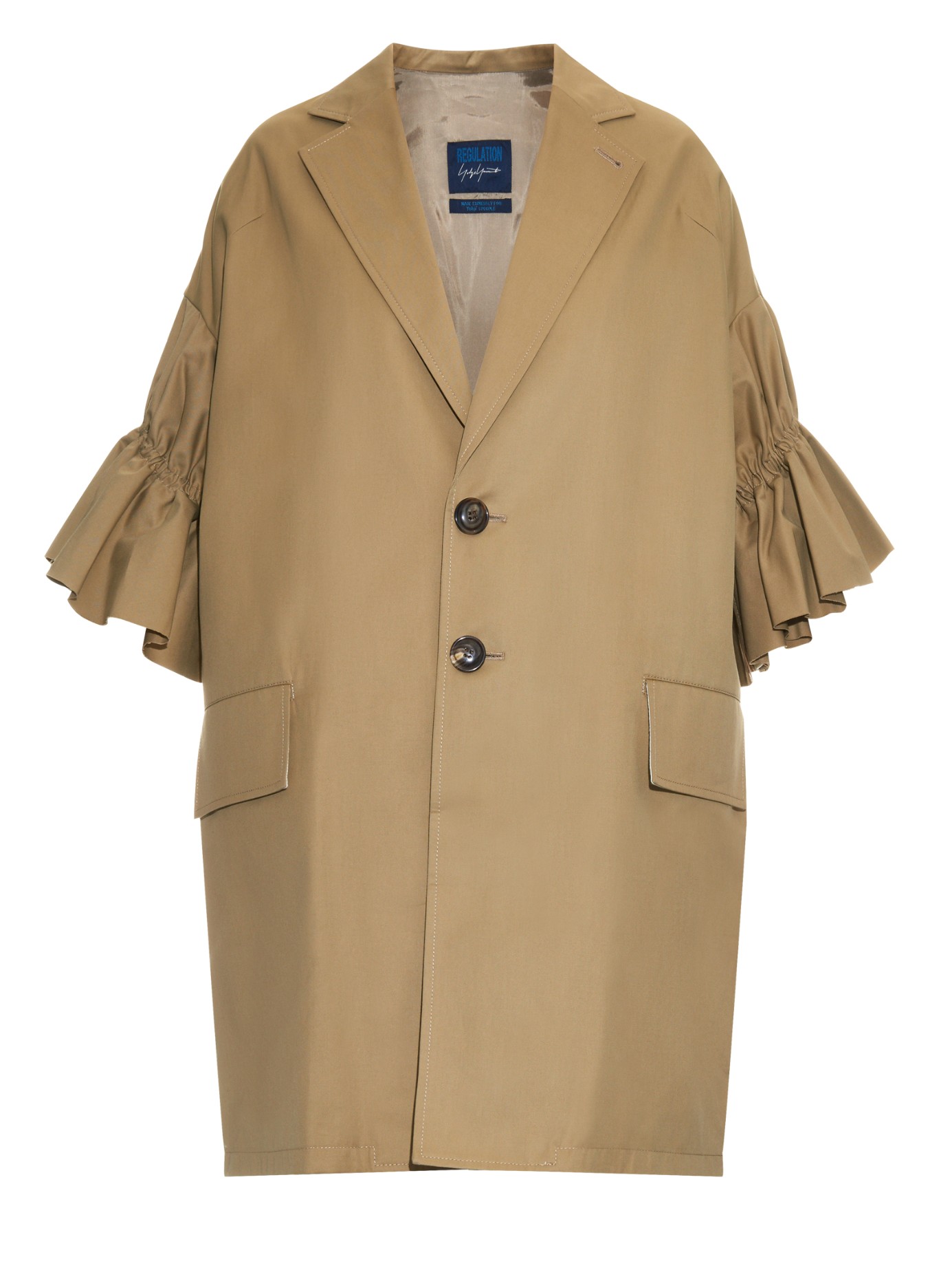 Selena is wearing a Yohji Yamamoto Regulation Oversized Ruffle-Sleeve Cotton Coat in Black $1,424. Only the camel colour is currently available.