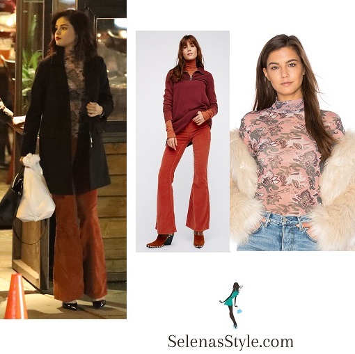 Selena is wearing Free People Penny Pull-On Cord Flare‘s $78 in Copper. Classic Free People pull-on cords featured in a clean silhouette with an extreme flare slight stretch and back pockets. This mid-rise style has an elastic waistband for an easy fit.