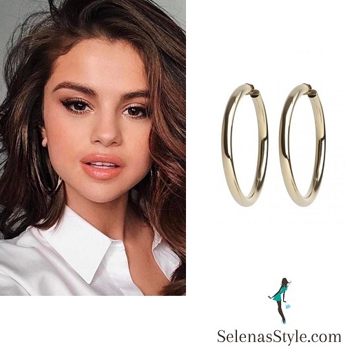 Selena’s earrings are Jennifer Fisher 2.5″ ‘Samira’ Hoops in 14k Yellow Gold Plated Brass $550. They were inspired by stylist Samira Nasr.
