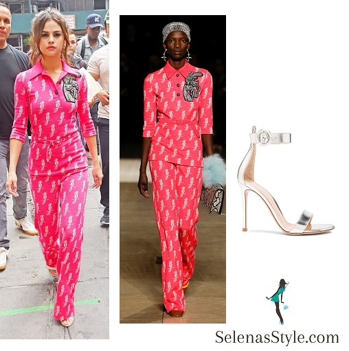 Selena is wearing a Miu Miu top and trousers jumpsuit from the Fall 2107 collection (not yet available).