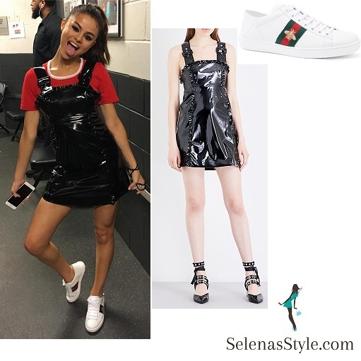 Selena’s shoes are Gucci New Ace Convertible Heel Sneakers $595 in White. Pre-order this style today! Add to Shopping Bag to view approximate ship date. You’ll be charged only when your item ships.Golden bee embroidery marks the signature Web stripe insets at the sides of a snowy leather sneaker handcrafted in Italy-while a drop-down heel allows you to wear the statement style as a slide.