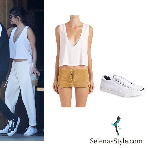 Selena’s shoes are Signature Jack Purcell Converse Low Top Sneakers $95 in White. Introducing one of Our Favorite Brands: Converse. The Jack Purcell Low Top Sneaker has a signature low profile and features a clean look with a rubber sole and canvas upper. We last saw Selena wearing these in June.