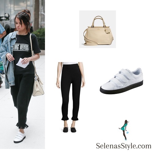 Selena’s shoes are Puma Basket Classic Strap Black and White Trainers £35 in Puma White-Puma Black. The Basket Classic Strap’s distinct feature is its originated closure of three functional hook-and-loop straps. The sleek leather upper with embossed detailing gives the B&W pack a bold and urban look.