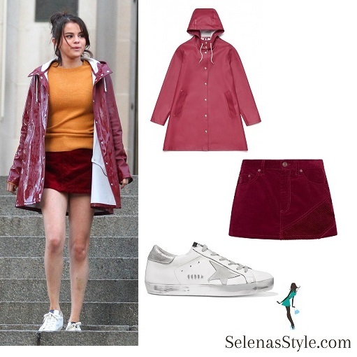 Selena’s coat is a Stutterheim Mosebacke raincoat $295 in Burgundy. The Stutterheim Mosebacke Burgundy raincoat is the women’s A-line version of their iconic raincoat. This feminine model has a beautiful silhouette with a spacious cut. It is handmade in rubberized cotton, comes unlined, with double welded seams, snap closures and cotton drawstrings. The finest craftsmanship is used to create this style, here in a beautiful burgundy version with silver buttons.