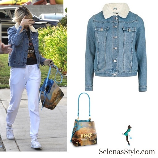 Selena is wearing a Topshop Borg Western Jacket $110 in Mid Stone. Denim goes western in this MOTO vintage wash jacket. Comes with a soft borg collar, button front and handy chest pockets. We last saw Selena wearing this in November.
