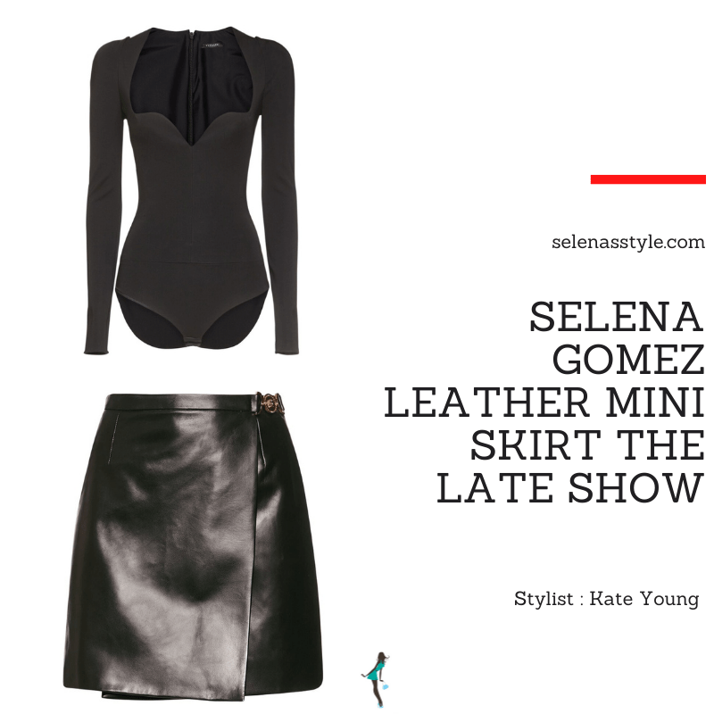 Selena wore a Versace Medusa Wrap Leather Mini Skirt $2,195 in Black, on The Late Show With Stephen Colbert on 8 September 2021. Selena was styled by Kate Young. Make-up was by Hung Vanngo. Nails by Tom Bachik. Hair by Anh Co Tran.
